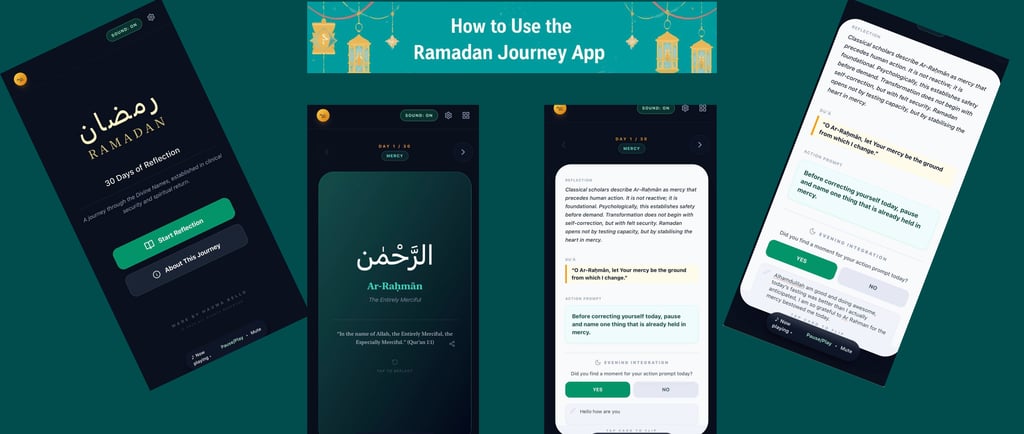 A practical guide to using the Ramadan Journey App in just 7 minutes a day—without turning Ramadan into another task. Learn the “presence, not performance” rhythm, what to do on busy days, how the Sunnah Secret (morning) and Longevity Prompt (evening) support consistency, and how the Evening Integration YES unlocks the next day. Includes a full Day 1 walkthrough (Ar-Raḥmān) so you can start immediately with clarity and confidence.